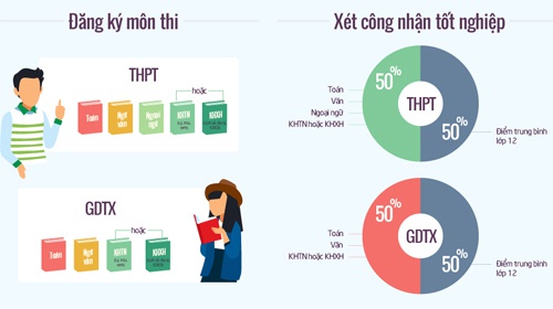 Để xét công nhận tốt nghiệp THPT, thí sinh THPT phải dự thi 4 bài thi, gồm 3 bài thi độc lập là Toán, Ngữ văn, Ngoại ngữ và một bài thi tự chọn trong số 2 bài thi tổ hợp. Thí sinh giáo dục thường xuyên dự thi 3 bài, gồm 2 bài thi độc lập là Toán, Ngữ văn và một bài thi do thí sinh tự chọn trong số 2 bài thi tổ hợp.