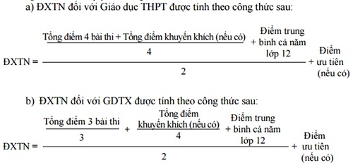 Theo quy chế, điểm xét tốt nghiệp (ĐXTN) gồm điểm các bài thi thí sinh dự thi để xét công nhận tốt nghiệp THPT, điểm ưu tiên, khuyến khích (nếu có) và điểm trung bình cả năm lớp 12. Điểm của từng bài thi được quy về thang điểm 10 để tính ĐXTN.