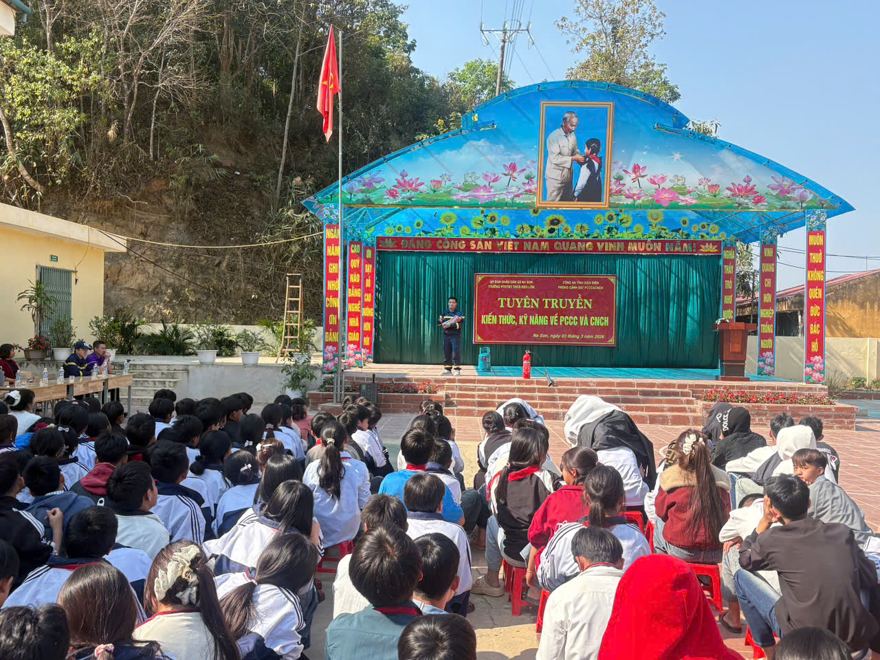 Tham dự buổi tuyên truyền có đông đủ cán bộ quản lý, giáo viên, nhân viên cùng toàn thể học sinh nhà trường. Sân trường vùng cao vốn quen với tiếng đọc bài, tiếng cười đùa của học trò hôm nay trở nên trang nghiêm nhưng không kém phần sôi nổi bởi sự hiện diện của các cán bộ, chiến sĩ lực lượng Cảnh sát phòng cháy, chữa cháy và cứu nạn, cứu hộ. Sự có mặt đầy đủ, nghiêm túc của tập thể nhà trường đã thể hiện tinh thần trách nhiệm cao đối với công tác bảo đảm an toàn trường học – một nhiệm vụ quan trọng trong bối cảnh hiện nay.